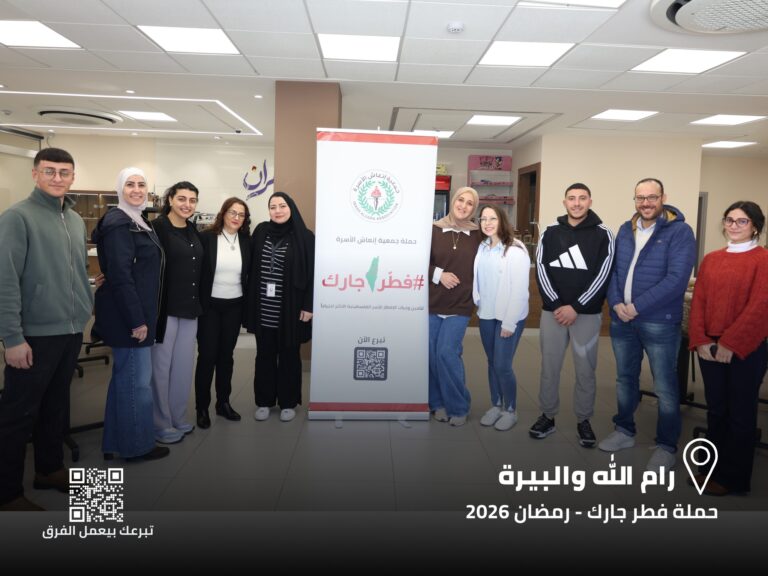 للعام الحادي عشر على التوالي، تطلق جمعية إنعاش الأسرة حملة “فطّر جارك”، التي تهدف إلى توزيع وجبات إفطار ساخنة للأسر المحتاجة في مختلف المحافظات الفلسطينية طوال شهر رمضان المبارك. تقوم الجمعية يوميًا بإعداد الوجبات وتوزيعها على العائلات المستهدفة من خلال فرق المتطوعين المنتشرة في عدة مواقع. خلال العام الماضي، نجحت الجمعية في تقديم 81521 وجبة إفطار للعائلات الفقيرة في مخيم جنين، والبلدة القديمة في نابلس، وبلدة حوارة، ومخيم عقبة جبر في أريحا، إضافة إلى محافظة رام الله والبيرة، وكان لقطاع غزة النصيب الأكبر بنسبة 55% من الوجبات الموزعة. نطمح هذا العام إلى حشد دعم أكبر لتوسيع نطاق الحملة والوصول إلى مناطق جغرافية أوسع، بما يضمن إدخال البهجة إلى قلوب المزيد من الأسر المحتاجة.