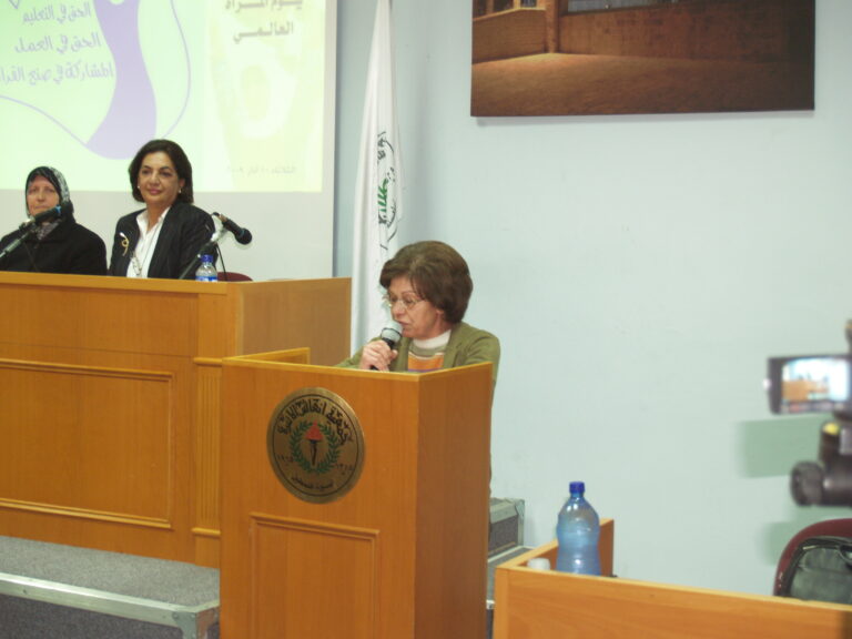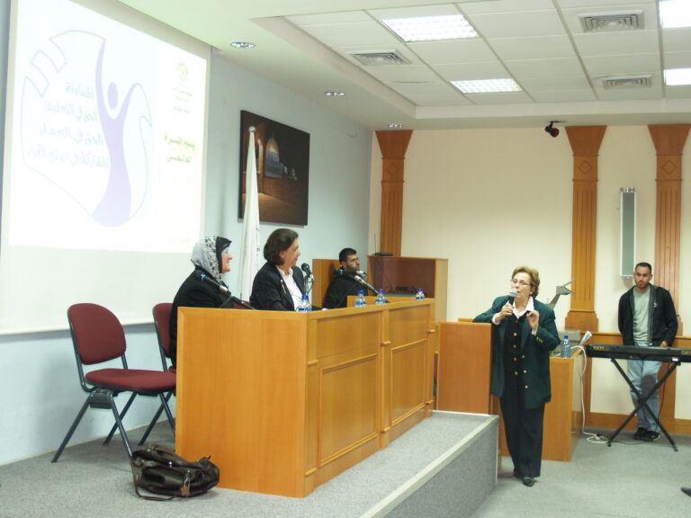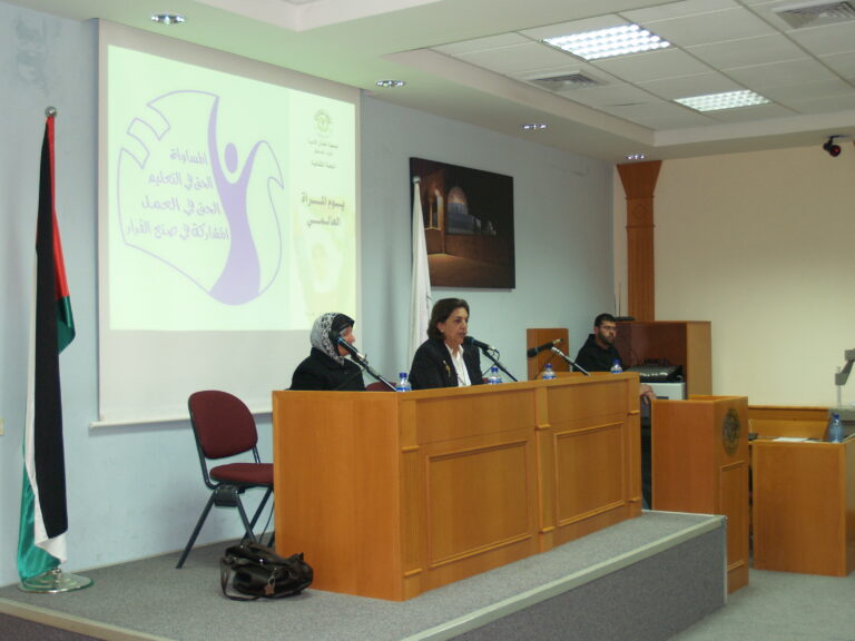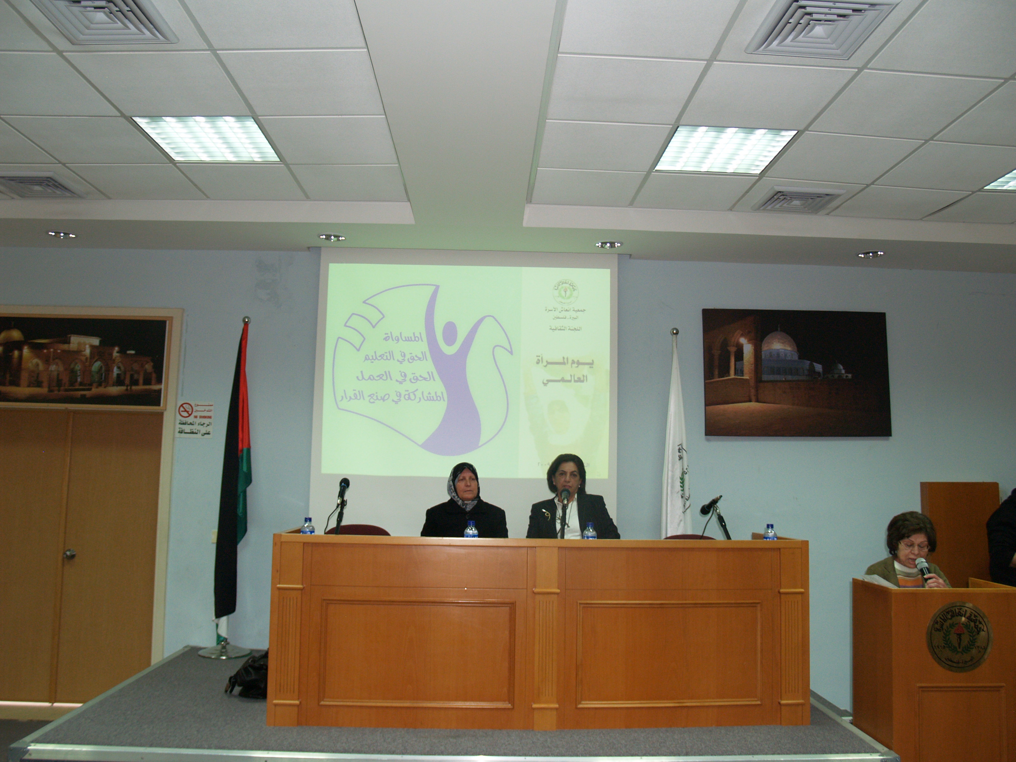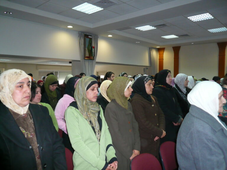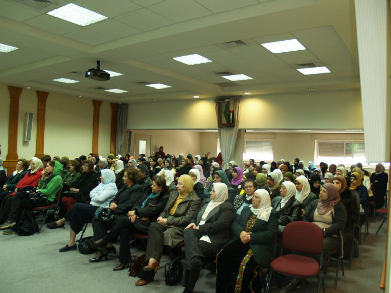 كما هو الحال في كل عام جمعية إنعاش الأسرة تحيي هذه المناسبة حيث دعت اللجنة الثقافية بجمعية إنعاش الأسرة للاحتفال بهذا اليوم والذي له خصوصية للمرأة الفلسطينية صانعة الأمجاد والمعجزات وذلك بحضور حشد غفير من ممثلي الجمعيات الخيرية في رام الله والبيرة وموظفات ومتدربات وطالبات جمعية إنعاش الأسرة حيث استُهل الحفل بالسلام الوطني وقراءة الفاتحة على أرواح الشهداء ورأست الحفل الآنسة عفاف عقل عضو الهيئة الإدارية ورئيسة اللجنة الثقافية لجمعية إنعاش الأسرة والتي بدورها رحبت بالحضور الكرام وأثنت على دورة المرأة الفلسطينية صانعة الأمجاد وأم وأخت الرجال. وفي كلمتها أثنت الآنسة نهلة بسيسو نائبة رئيسة الجمعية على المرأة الفلسطينية في كافة نواحي مسيرتها وكفاحها وركزت على بعض الجوانب المضيئة من حياة المرأة الفلسطينية المجاهدة. وكانت مفاجأة الحفل (أم كامل الكرد) ومن منا لا يعرف أم كامل الكرد وهي زوجة الشهيد والمهجرة والمضطهدة والصابرة والتي تركت الدنيا خلف ظهرها بعزة وإباء وشموخ رافضة التنازل عن شبر من أرضها ماكثة في خيمتها صامدة رغم هدمها المتكرر. وهي التي علمت المرأة الفلسطينية كيف تحمي بيتها رمز كرامتها وعزها. وهي من قال عنها القنصل البلجيكي “المرأة الفلسطينية تقود الرجال” فكانت مثلاً للمرأة الفلسطينية ولهذا ووفاءً بجزء من حقها علينا رأت الهيئة الإدارية للجمعية ضرورة وواجب لتكريم هذه المرأة وهذا ما ركزت عليه السيدة فريدة العمد / رئيسة الجمعية في كلمتها وأثنت على المرأة الفلسطينية وكم هي سعيدة بوجود هذا النموذج المشرّف للمرأة الفلسطينية (أم كامل) في هذا اليوم بين أخواتها المناضلات، واستطردت السيدة فريدة العمد بالحديث عن الهجرة والنكبات التي آل إليها الشعب الفلسطيني من نكبة إلى أخرى كما تعرضت لمحاولات إسرائيل لتهويد القدس وانتزاع كل ما هو عربي وإسلامي ومسيحي منها وتحدثت عن سماحة الأديان وذكرت الآية الكريمة :” آمن الرسول بما أنزل إليه من ربه والمؤمنون، كل آمن بالله وملائكته وكتبه ورسله …” وأن القدس أرض المحشر والمنشر . فمنذ 60 عام فلسطين والقدس مستهدفتين ولذلك يحاول اليهود محو كل ما يمت لتاريخنا بصلة . ولكنا صابرون صابرون صابرون “وبشر الصابرين” قالتها وعيناها تدمعان شوقاً للقدس. وهنا غنى أطفال روضة إنعاش الأسرة:” يالله نغني القدس عربية القدس القدس القدس لنا”