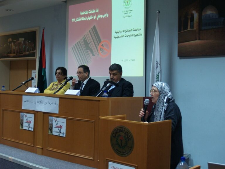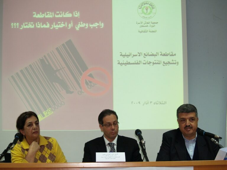 أقامت اللجنة الثقافية في جمعية إنعاش الأسرة يوم أمس ندوة ثقافية حول مقاطعة البضائع الإسرائيلية وتشجيع الصناعات الوطنية المحلية بحضور عدد غفير من ممثلي الجمعيات النسائية وأعضاء الجمعية ومتدربات الأقسام المهنية والموظفين وقد رحبت خولة غوشة عضو اللجنة الإدارية والثقافية في الجمعية بالحضور وأشادت بضرورة تشجيع الصناعات الوطنية وتحدث في الندوة كل من : صلاح هنية / الراصد الاقتصادي وفؤاد الأقرع / مدير عام الصناعات الغذائية وإياد المسروجي مدير عام شركة القدس للمستحضرات الطبية وعفاف عقل عضو الهيئة الإدارية ورئيسة اللجنة الثقافية في الجمعية . وقد تناول الجميع أهمية مقاطعة البضائع الإسرائيلية والتركيز على تشجيع الصناعة الوطنية ذات المواصفات العالية والتي تضاهي الصناعة الإسرائيلية والأجنبية وقد تطرق المتحدثين إلى حاجة المجتمع الفلسطيني الى توعية وثقافة دينية ووطنية تؤدي إلى الامتناع عن شراء المنتوجات الإسرائيلية.