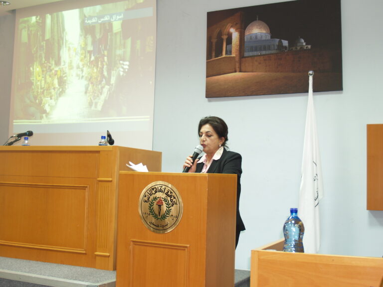في بداية الاحتفال رحبت عفاف عقل عضو الهيئة الإدارية ورئيسة اللجنة الثقافية بالحضور ثم بدأ الحفل بالسلام الوطني وقراءة الفاتحة وتلاوة آيات من الذكر الحكيم. وقدمت مداخلة حول أهمية مدينة القدس بالنسبة للشعب الفلسطيني وللشعوب العربية والإسلامية وما تمثله للأديان السماوية . وبدورها رحبت فريدة العمد رئيسة الجمعية بالحضور وقالت إن إسرائيل تحاول فرض سيطرتها على القدس لإلغاء هويتها العربية الإسلامية… من خلال طمس معالمها التاريخية والتراثية وهدم أحياء عربية بالكامل لتهجير أهلها والسعي إلى فرض سياسة الأمر الواقع… في خطوة استباقية لإلغاء الحق الفلسطيني فيها.لا شك أن اغتصاب إسرائيل لبيت المقدس كان كارثة على جانب كبير من الخطورة لمئات الملايين من المؤمنين، ولذلك بقي الصراع محتدماً وسيبقى ما دامت أرضنا محتلة وقدسنا مغتصبة.