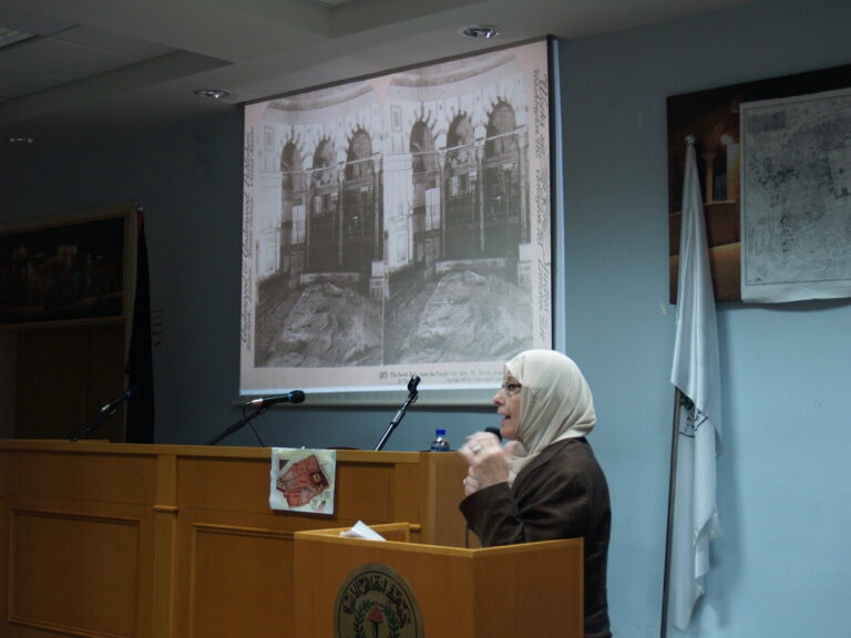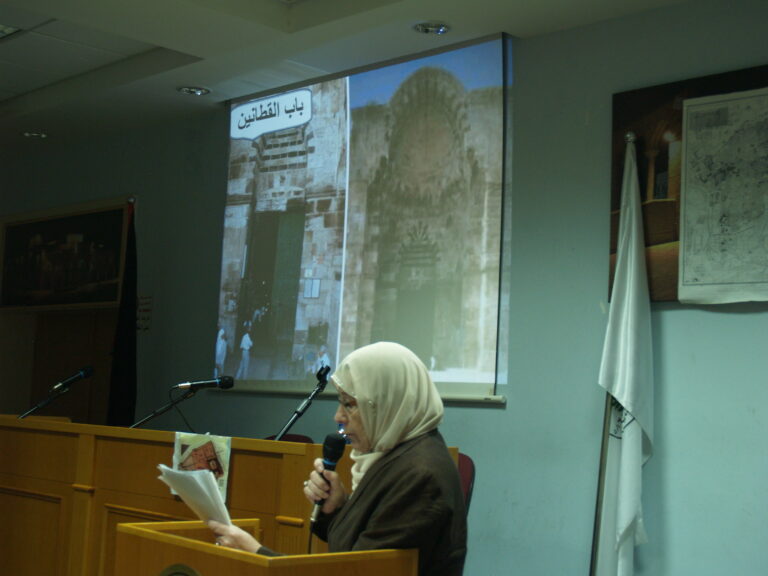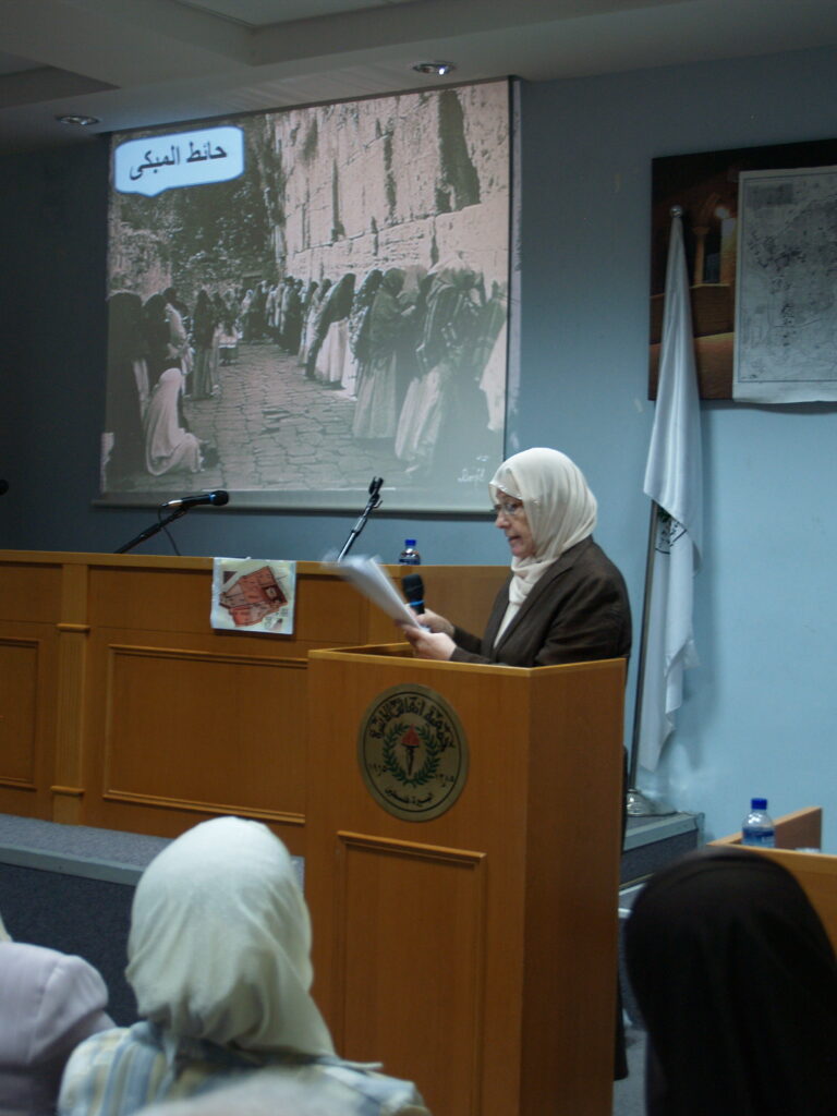 وقدمت الأخت “أمل الدجاني كاتبة” عضو الهيئة الإدارية لجمعية إنعاش الأسرة والحاملة لماجستير في الدراسات التاريخية المعمارية والتي أسهبت في حديثها عن القس والتي تطرقت إلى تاريخ القدس وحضارتها على مر العصور والأزمنة من مراحل قوة ومراحل ضعف. كما أعطت نظرة شاملة لتقسيمات مدينة القدس التاريخية من أبواب وأزقة وشوارع ومدارس وقباب وكذلك الفن الإسلامي المعماري والذي تجلى في أسوار القدس وقبة الصخرة وحائط البراق وغيرها من المعالم والشواهد التي تثبت، وتدلل على تاريخ القدس العريق الذي تناقلته الأجيال حتى وصل إلينا. وكذلك دور القدس العظيم في نشر الثقافة والعلم وكذلك حلقات العلم والدروس التي كان يعقدها العلماء في القدس فكانت منارة للعلم والمعرفة.