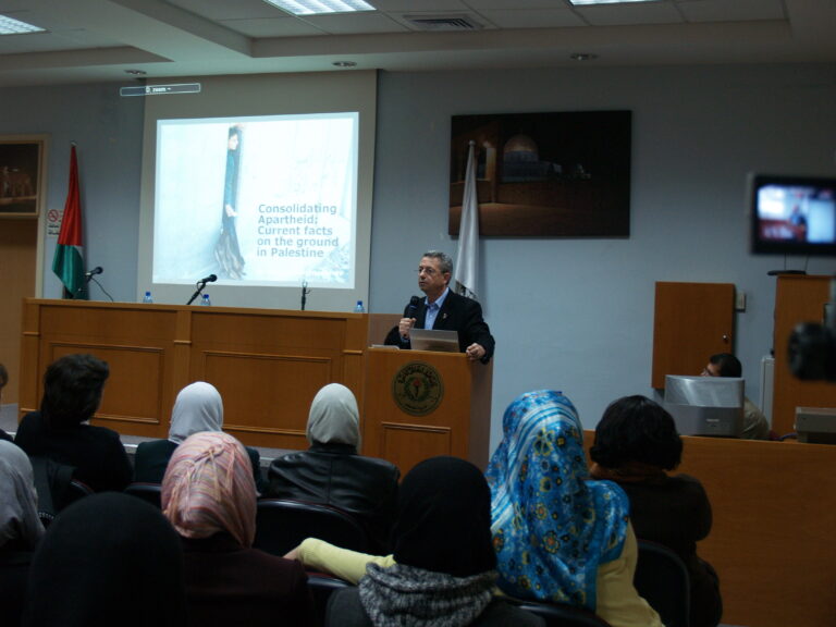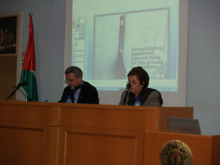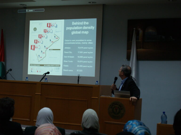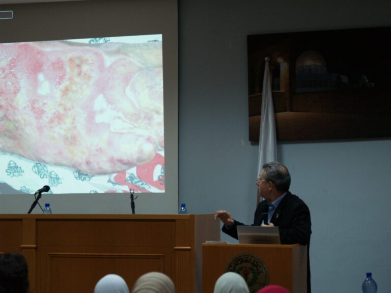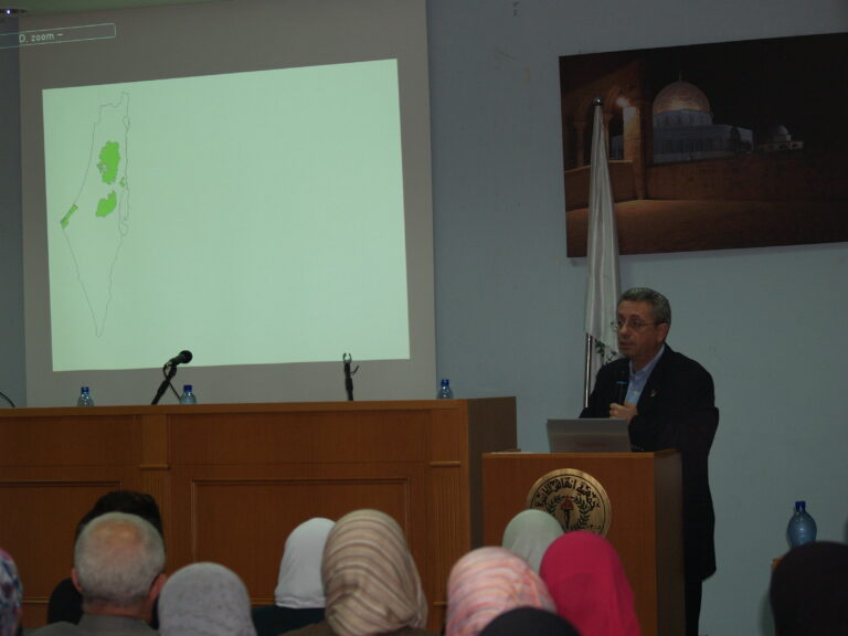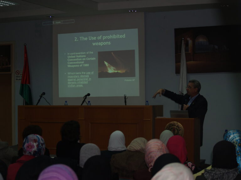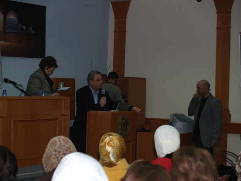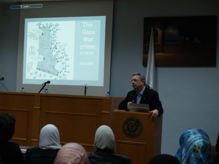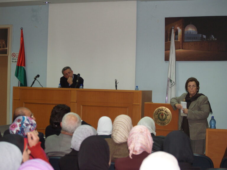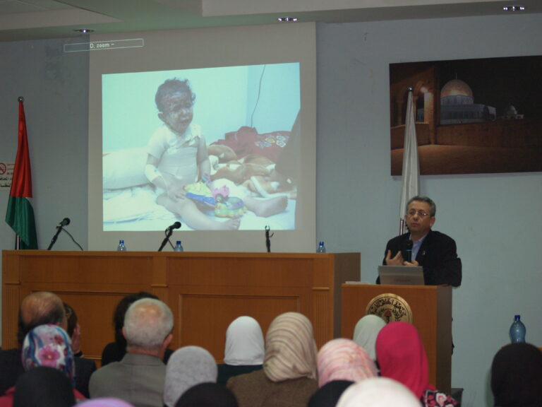نظمت اللجنة الثقافية للجمعية لقاءً خاصاً مع الدكتور مصطفى البرغوثي أمين عام المبادرة الوطنية الفلسطينية وبحضور الهيئة الإدارية وحشد غفير من موظفي وموظفات وطالبات الجمعية و”كلية إنعاش الأسرة”. وتحدث الدكتور البرغوثي حول الوضع السياسي الراهن وحرب إسرائيل الأخيرة وعدوانها على قطاع غزة وكذلك ممارسات الاحتلال الإسرائيلي ابان الحرب وتركيزه على قتل عدد كبير من المواطنين وإصابة العدد الأكبر والتسبب في الأمراض المزمنة وكان ذلك واضحاً وجلياً في استخدام الإسرائيليين لعدد كبير جداً وضخم من قنابل الفسفور المحرم دولياً والذي يعمل على الفتك بالإنسان وتعطيل وظائف الكبد والرئة والكليتين عند استنشاقه علاوة على استخدام الـ “DISK BOMB” وأنواع كثيرة من الأسلحة غير مجربة تم تجريبها في قطاع غزة.