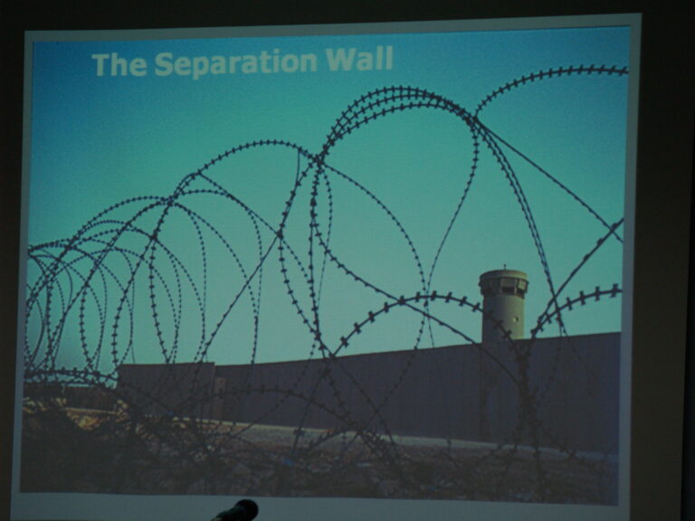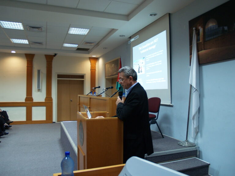 وأضاف الدكتور البرغوثي بأن الإسرائيليين ولم يكتفوا بذلك حيث قاموا بتدمير المنازل التي زاد عددها عن 25000 منزل والبساتين وكذلك تدمير أكثر من 352 مصنع في القطاع في محاولة لهدم البنية التحتية وتجويع الشعب وعزله عن العالم وقطع كل الإمدادات الغذائية والاحتياجات الإنسانية الأخرى كالدواء والوقود. الا انه ورغم كل ذلك لم يجني الإسرائيليين إلا الهزيمة والقهر وزيادة صمود الشعب. وحول ما تقوم به اسرائيل في الضفة فقد حاولت فصل الضفة الغربية بطريقة أخرى وهي جدار العزل العنصري الذي ابتلع الأراضي وابتكار نظام التصاريح الذي اختلقه الإسرائيليين للسماح للناس دخول أراضيهم كأراضي بلدة جيوس وكذلك خنق قلقيلية بالجدار الخانق.