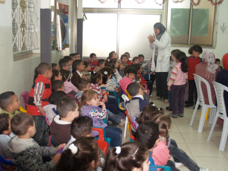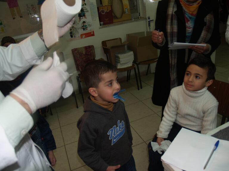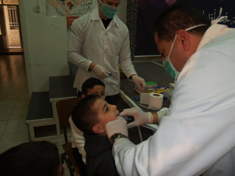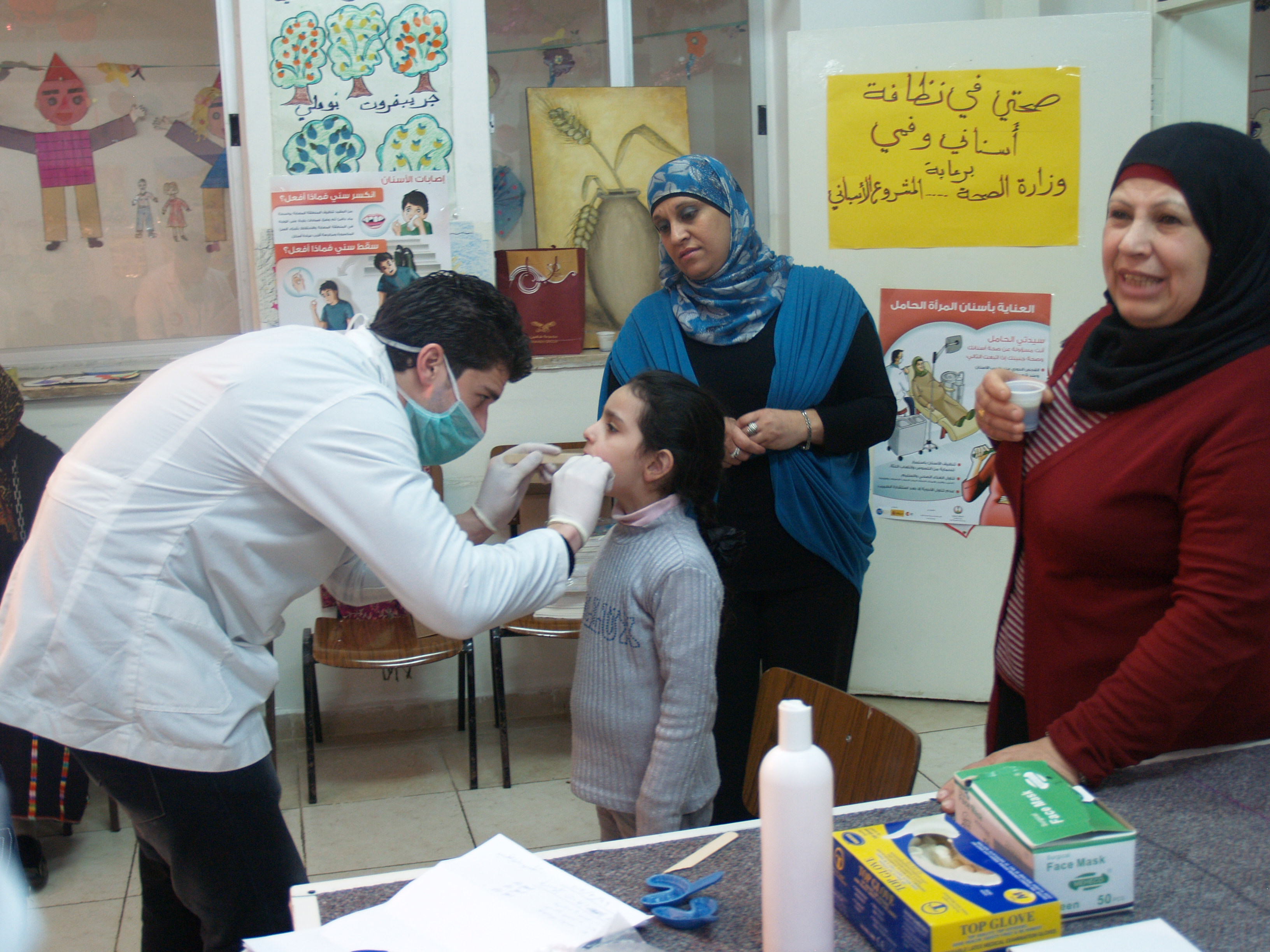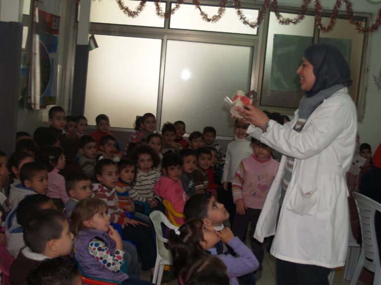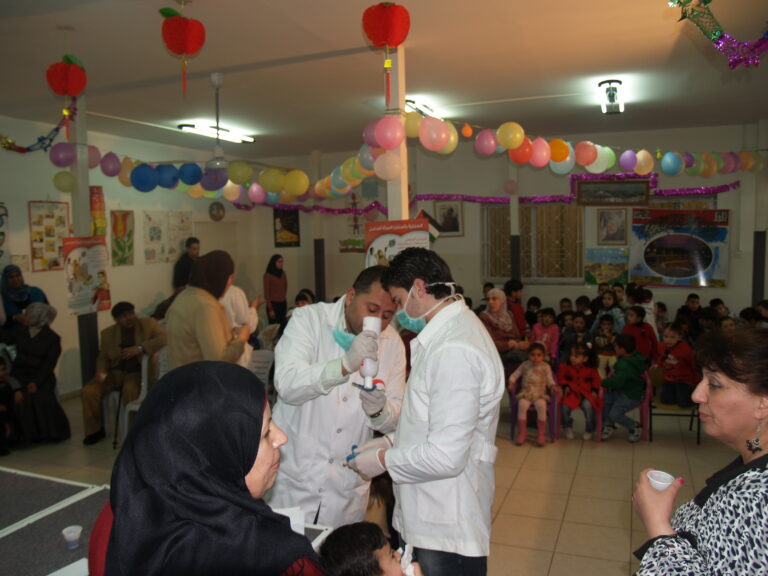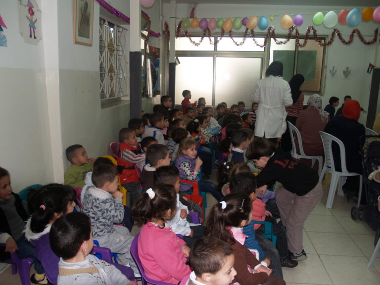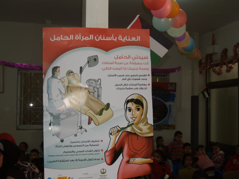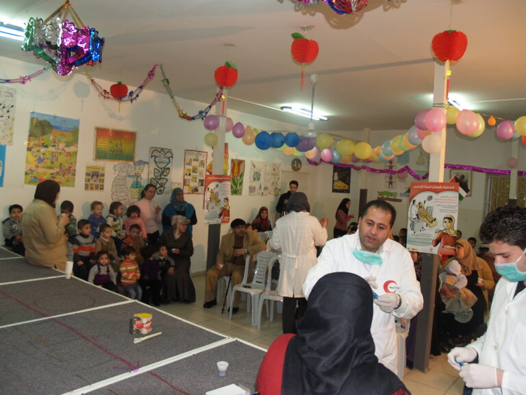 ضمن فعاليات أسبوع صحة الفم والأسنان الذي تنظمه وزارة الصحة الفلسطينية تم عمل نشاط توعوي لأطفال روضة وحضانة جمعية إنعاش الأسرة بحضور أهالي الأطفال حيث تم عمل فحص لأسنان كافة الأطفال من خلال د. ميساء جرار و د. فادي العاصي و د. مهند البشير. كما تم تقديم شرح مفصل عن كيفية العناية بالفم والأسنان وكذلك تم تعريف الحاضرين بالمأكولات التي تسبب سوء وتسوس الأسنان. وكذلك تم معالجة أسنان الأطفال بجرعة وقائية من مادة الفلورايد لتقي الأسنان التسوس. وفي ختام الندوة تم تقديم هدايا رمزية للأطفال.