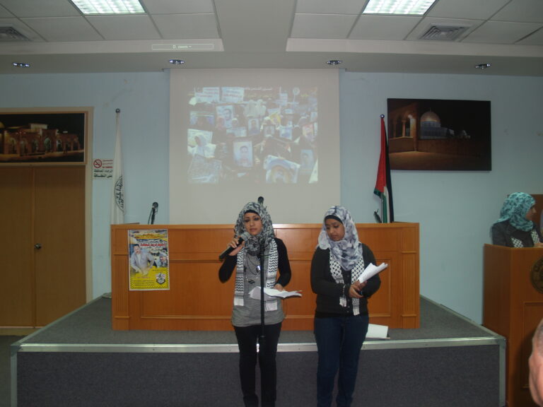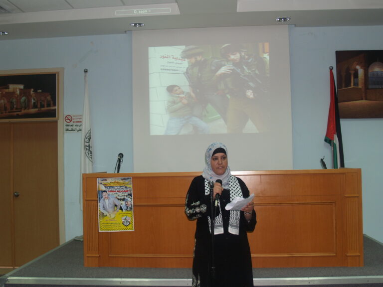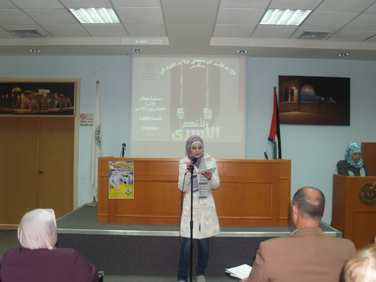 وقد تخلل الاحتفال عدد من المشاركات احتفالا بيوم الاسير كان من بينها اغنية القتها احدى المشاركات بعنوان ” يا امي ظلموني الناس ” بالاضافة الى قصيدة شعرية في يوم الاسير. كما تحدث والد احد الاسرى حث فيها الشباب الفلسطيني على ضرورة الوقوف مع الاسير والقضية الفلسطينية. وقد اعرب الحضور عن استياءهم من السياسات والاجراءات الاسرائيلية اللانسانية اتجاه الاسرى والمعتقلين مطالبين المجتمع الدولي عامة وهيئة الامم المتحدة خاصة بضرورة تحمل مسؤولياته اتجاه الاسرى الفلسطينيين. وفي نهاية الندوة حي الحضور الاسرى والمعتقلين وقدمت جمعية انعاش الاسرة هدية متواضعة لكل اسير، واقامت مادبة غداء تكريما لهم ولنضالهم وتضحياتهم .