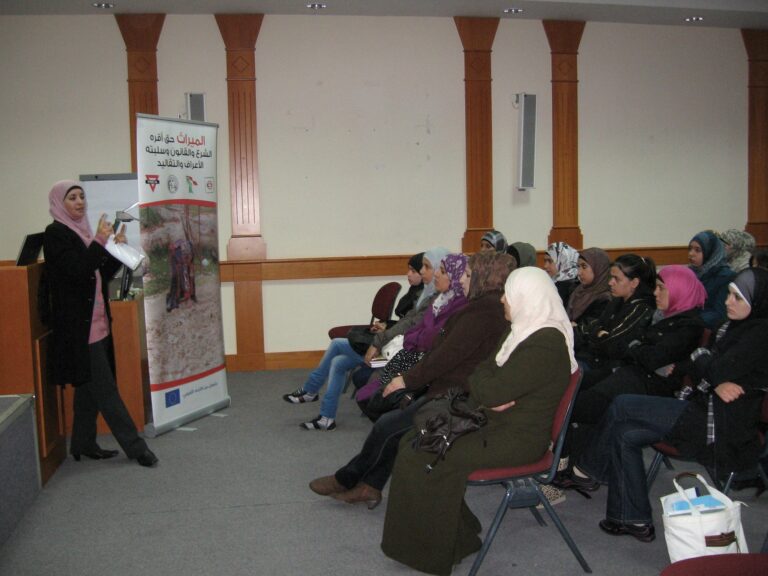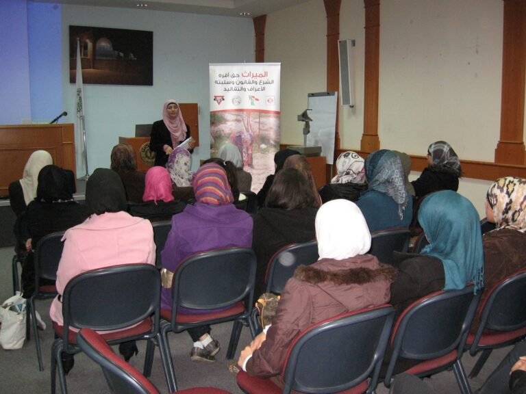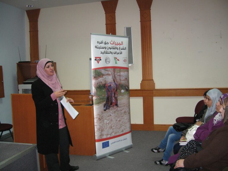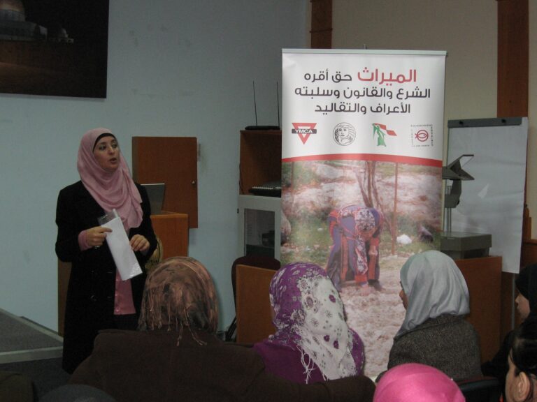ضمن سلسلة النشاطات الثقافية التي تنظمها الجمعية للارتقاء بالمرأة الفلسطينية تم تنفيذ لقاء توعوي بعنوان (الحق في الميراث) والذي يعد واحداً من سلسلة لقاءات تُعقد لتوعية المرأة الفلسطينية وبيان حقوقها الشرعية والقانونية في الميراث ، حضر اللقاء طالبات المركز الثقافي التابع للجمعية وقد قامت المحامية علا علي من جمعية الشبان المسيحية بعرض فيلم مسجل يظهر حق المرأة في الميراث ويعكس واقع امرأة فلسطينية حصلت على حقها الشرعي في ميراث والدها وأخرى حرمت من هذا الحق وكذلك تم استعراض الرؤية الشرعية في هذا المجال حيث قامت المحامية علا علي بشرح القوانين والتشريعات التي كفلها الشرع الإسلامي الحنيف وكذلك القوانين السارية في الأراضي الفلسطينية والتي تعزز إنصاف المرأة وإعطائها الحق الذي كفله لها القانون وكذلك الشرع الإسلامي الحنيف. وفي نهاية اللقاء تمت الإجابة على تساؤلات الطالبات في مجال الميراث.