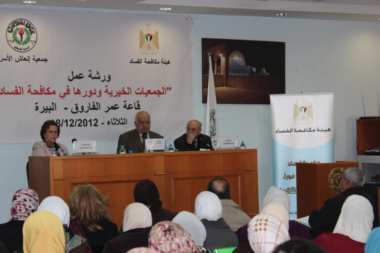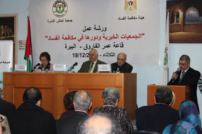 عقدت جمعية انعاش الأسرة بالشراكة مع هيئة مكافحة الفساد، لقاء في قاعة “الفاروق” التابعة للجمعية، بعنوان : “الجمعيات الخيرية وأثرها في مكافحة الفساد” وذلك ضمن اتفاقية الشراكة التي تم التوقيع عليها في حزيران الماضي بين الجمعية والهيئة. وحضر الورشة، رؤساء وأعضاء الهيئات الإدارية للجمعيات الخيرية في فلسطين وممثلون عن جمعية مدققي الحسابات الفلسطينية وجمعية المحكّمين وغيرهم من الدارسين والباحثين والمهتمين.