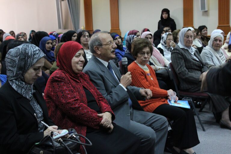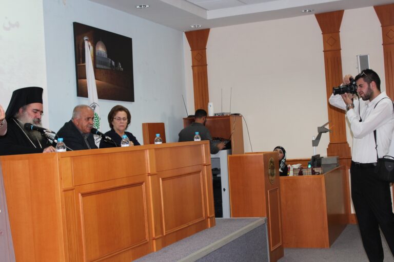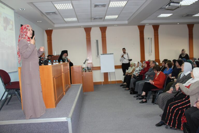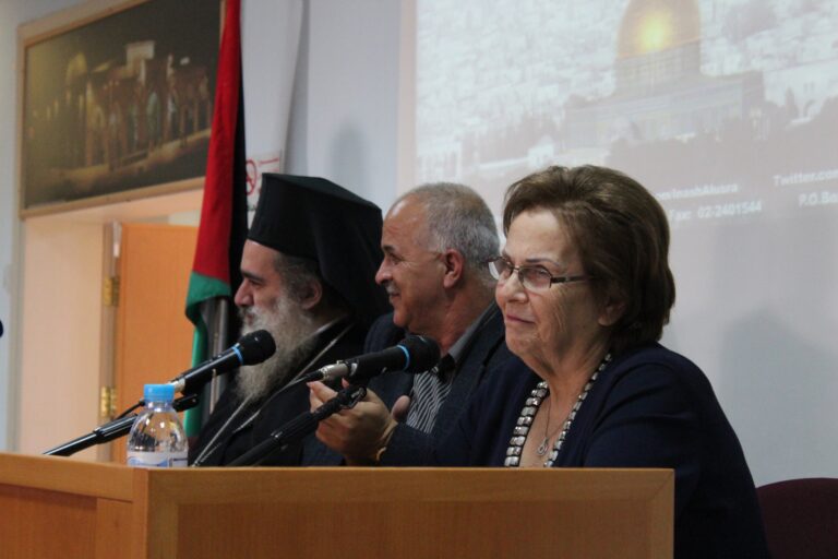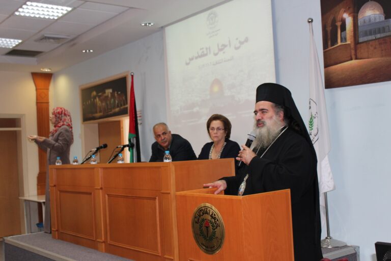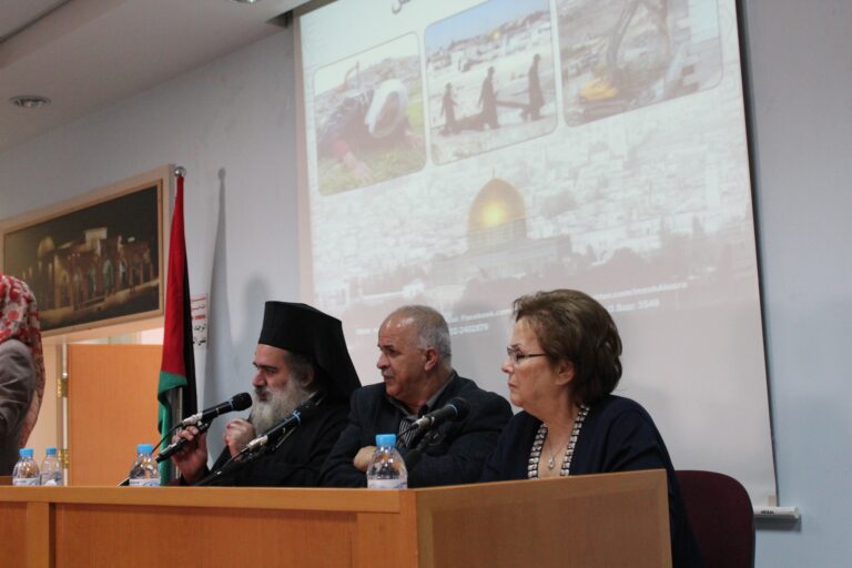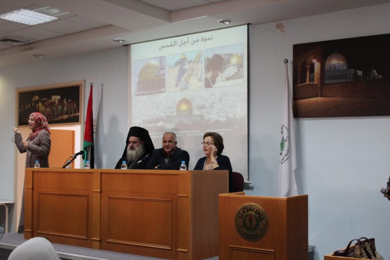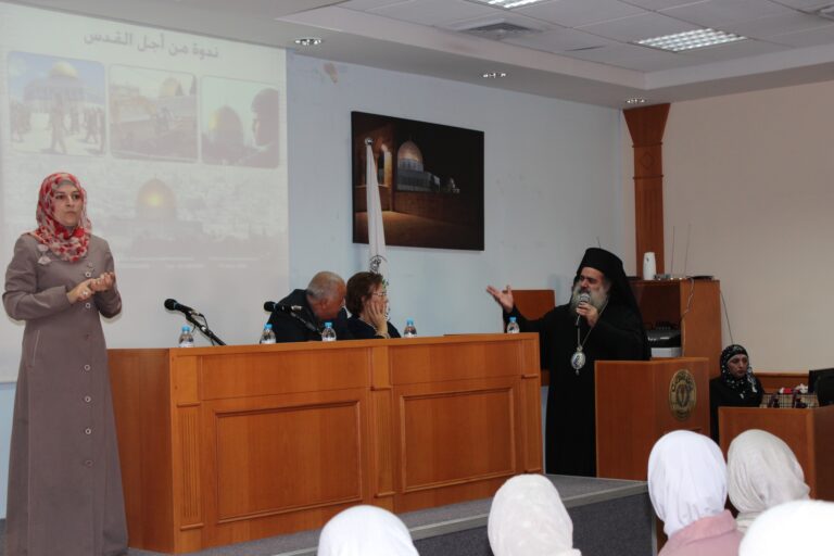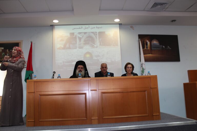 نظّمت جمعية إنعاش الأسرة في مدينة البيرة ندوتها الأولى حول المخاطر التي تهدد مدينة القدس وأهلها، وقد استضافت الجمعية كل من سيادة المطران الأب عطا الله حنا والكاتب الصحفي والمحلل السياسي الأستاذ راسم عبيدات كمتحدثيين رئيسيين في الندوة التي حضرها عدد من الشخصيات الإعتبارية وأعضاء الهيئات الإدارية والإستشارية والعامه في الجمعية وحشد من موظفيها وطالباتها. افتُتِحت الندوة بكلمة السيدة فريدة العمد رئيسة الجمعية رحبت فيها بالضيوف والحضور الكرام وأثنت على مشاركتهم للجمعية في مثل هذة اللقاءات الهامه التي تضعنا في صورة المستجدات والمخططات العنصرية الإسرائيلية ضد المدينة المقدسة خاصة وسائر الأراضي الفلسطينية بشكل عام .وقد أكدت السيدة العمد على أهمية القدس للمسلمين والمسيحين كافة في سائر أنحاء العالم ،وأن المسؤولية نحوها تتعاظم بقدر مكانتها ورمزيتها ،كما بقدر المخاطر التي تتهددها، “فهي بلد التاريخ والدين والمقدسات وهي مهد الأنبياء وأرض الرسالات السماوية ، وهي مدينة السلام التي تفتقر الى السلام”،وشددت رئيسة الجمعية على وجوب تضافر الجهود الفلسطينية والعربية الإسلامية والمسيحية منها لوقف الممارسات التعسفية على مدينة القدس وأهلها.
