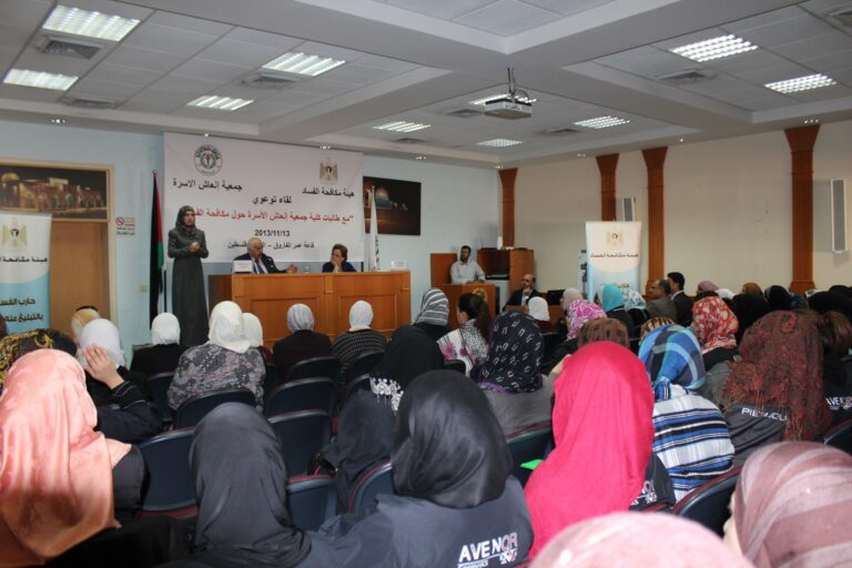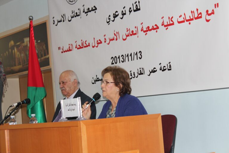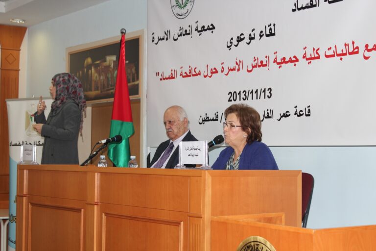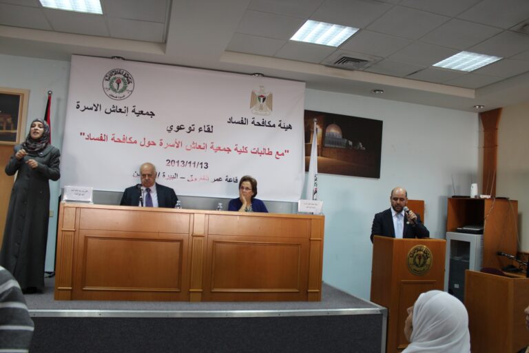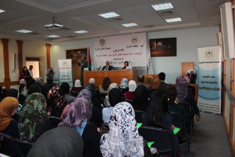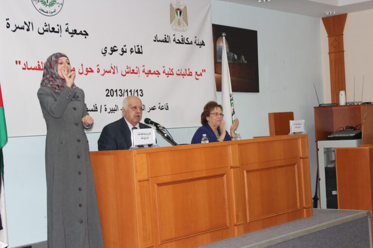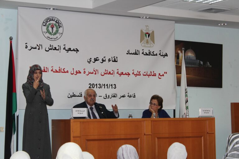 نظمت هيئة مكافحة الفساد الفلسطينية وبالتعاون مع شريكها الإستراتيجي جمعية إنعاش الأسرة لقاءاً توعويا ً لطالبات الجمعية ،في قاعة الفاروق عمر بن الخطاب بمبنى الجمعية بحضور رئيس هيئة مكافحة الفساد معالي السيد رفيق النتشة والسيدة فريدة عارف العمد رئيسة الجمعية وحشد من أعضاء وموظفي وطالبات الجمعية وقد رحبت السيدة فريدة العمد برئيس هيئة مكافحة الفساد والحضور جميعاً، وشكرت رئيس الهيئة على مبادرته الطيبة لتأسيس هيئة مكافحة الفساد ،وضم جمعية إنعاش الأسرة كشركاء استراتيجيين للهيئة.