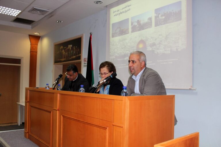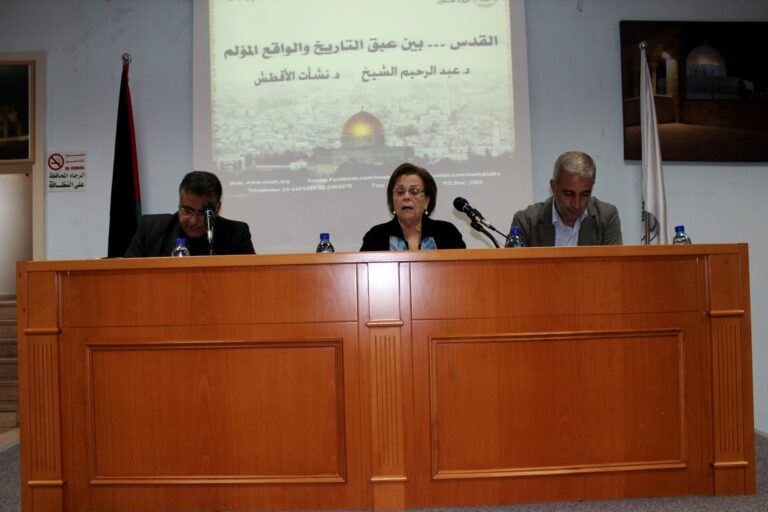 وتحدث المحاضر في دائرة الفلسفة والدراسات الثقافية د. عبد الرحيم الشيخ حول واقع القدس ضمن المتغيرات الدولية والعربية والمحلية الفلسطيني، وعن أهمية إعادة الاعتبار لمنظمة التحرير كبيت الكل الفلسطيني، وضبط منظومة احتضان فكرة المقاومة بكافة أشكالها. من ناحيته استعرض المحاضر في كلية الإعلام د. نشأت الأقطش بعض الأرقام والإحصائيات حول واقع المقدسيين في المدينة المقدسة مما يضع القدس حاليا في صراع وجود وهوية، وتحدث كذلك عن يهودية الدولة وتأثيرها في حياة الفلسطينيين في الداخل الفلسطيني المحتل.