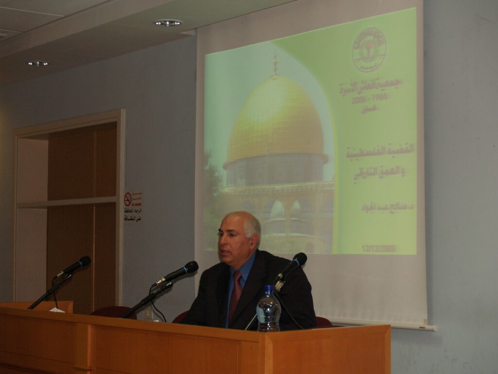نظمت جمعية إنعاش الأسرة في قاعة الفاروق يوم الثلاثاء الموافق 12 كانون الأول 2006 ندوة بعنوان “القضية الفلسطينية والعمق التاريخي”، ألقاها الدكتور صالح عبد الجواد، أحد أبرز الباحثين في التاريخ الفلسطيني. تناولت الندوة الجذور التاريخية للقضية الفلسطينية، وأثرها في تشكيل الهوية الوطنية، إضافة إلى استعراض المراحل المفصلية التي مرت بها فلسطين عبر العصور.