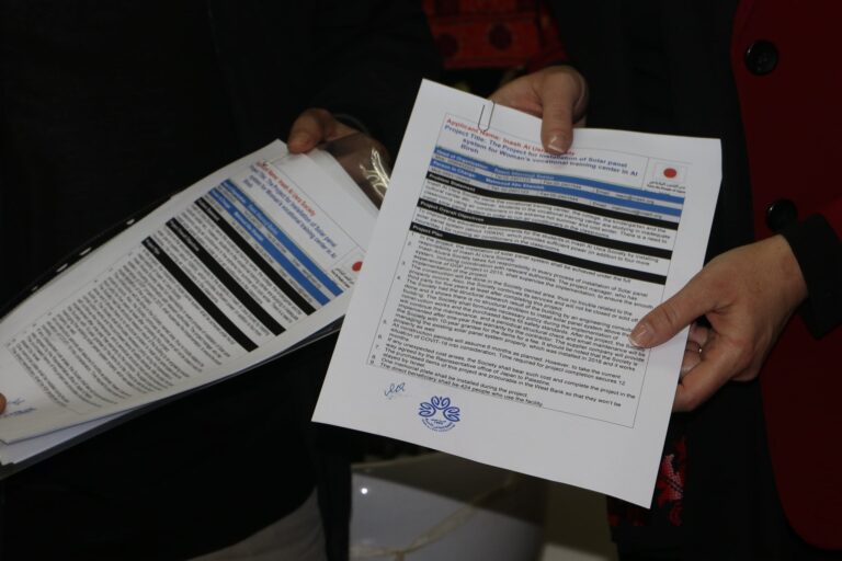 جمعية إنعاش الأسرة ممثلةً برئيسة مجلس الإدارة السيدة ريم مسروجي، والسفارة اليابانية ممثلة بمنسق المشاريع السيد عكرمة ريان يوقعان اليوم على اتفاقية شراكة لتنفيذ نظام توليد كهرباء بالطاقة الشمسية في المبنى الرئيسي للجمعية بمدينة البيرة، وتأتي هذه الخطوة دعمًا لسياسات الجمعية وتوجهاتها في التنمية المستدامة والخضراء.