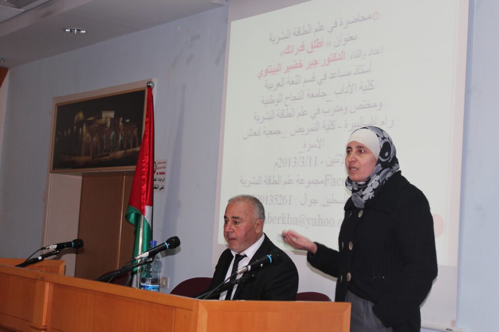 ضمن فعاليات اللجنة الثقافية للجمعية والتي تستهدف بناء قدرات الطالبات في المجالات الثقافية والمعرفية المختلفة قامت كلية إنعاش الأسرة باستضافة الدكتور جبر خضير البيتاوي الاستاذ المساعد في قسم اللغة العربية – كلية الاداب – جامعة النجاح الوطنية المدرب في علم الطاقة البشرية والذي قدم ندوة بعنوان أطلق